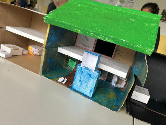 Die Kinder haben Gebäude aus Pappkartons hergestellt. Könnt ihr erkennen, um welche Gebäude es sich handelt?
