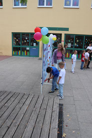 Und ansonsten zeigen wir den Kindern aus der 1b, wie das in der Schule so geht. Wo man Pausenpielzeug ausleihen kann und was in der Pause Spaß macht zu spielen, wo man Hilfe bekommt und so weiter.