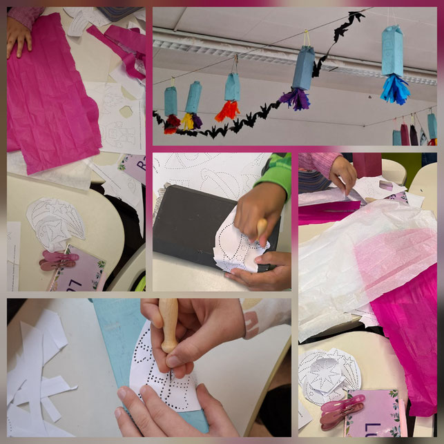 Wir fliegen diesmal ins All. Mit Laternen aus Milchpackungen. Die leuchten von innen heraus, weil wir mit Prickelnadeln Muster in die Packungen gestochen haben. Seid gespannt, wie sie am Martinsfest leuchten werden!!